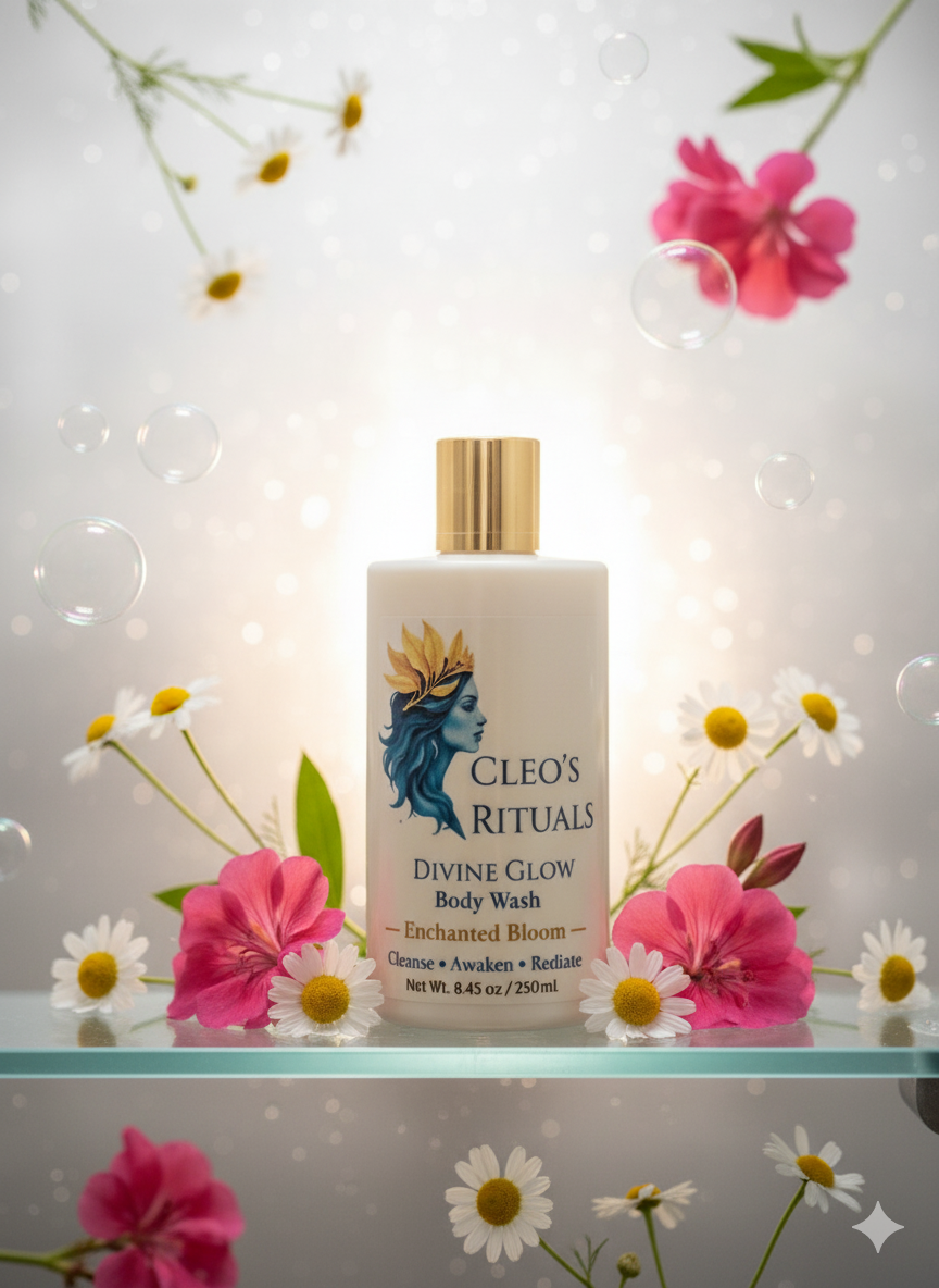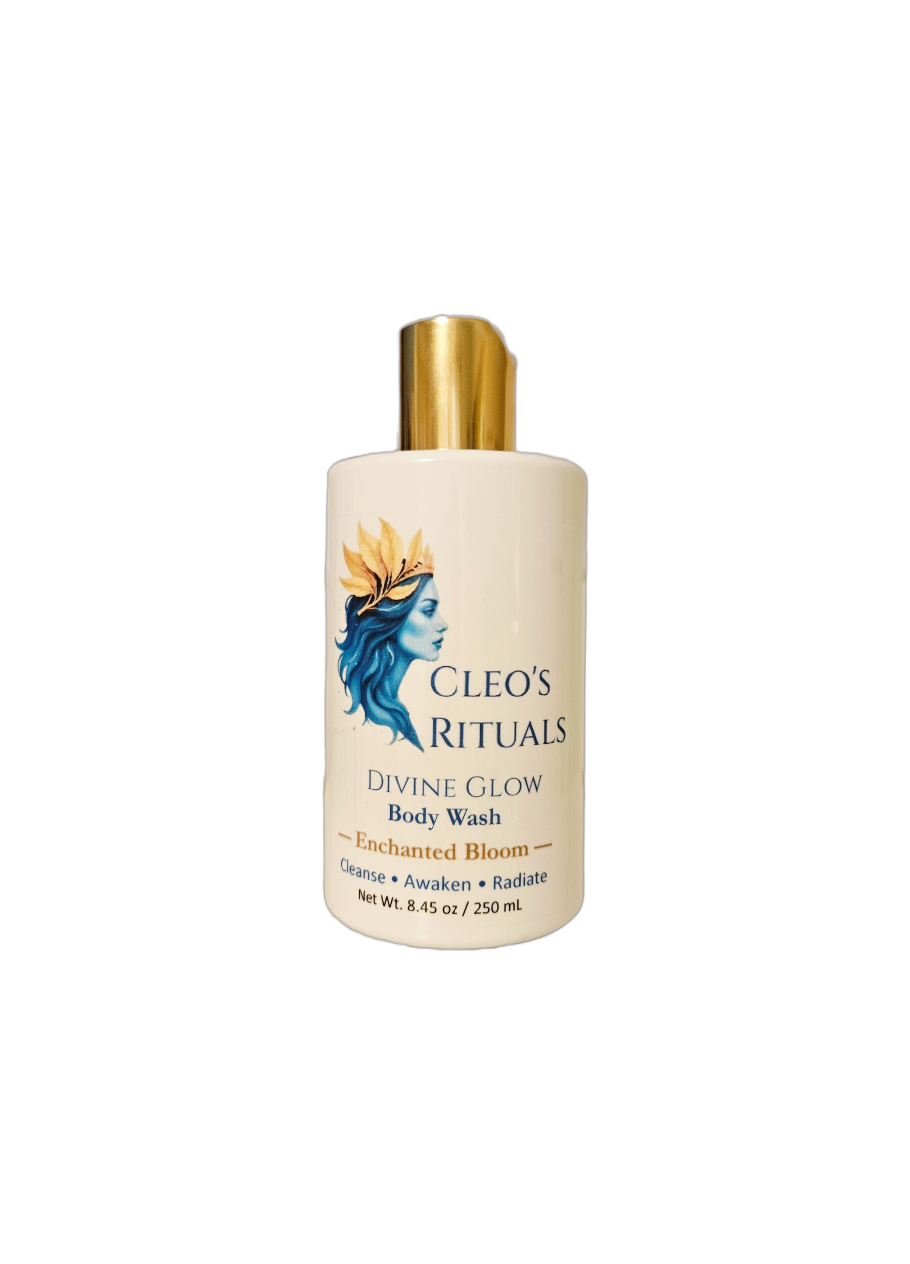 Cleo’s Rituals™ Divine Glow Body Wash transforms every shower into a goddess-level indulgence. Silky botanicals, gentle surfactants, and a touch of hyaluronic dew create a creamy, rich lather that hydrates and pampers your skin. Infused with soothing rose, aloe, and an Enchanted Bloom essential oil blend of Chamomile, Egyptian Geranium, & Frankincense your skin feels soft, radiant, and refreshed.